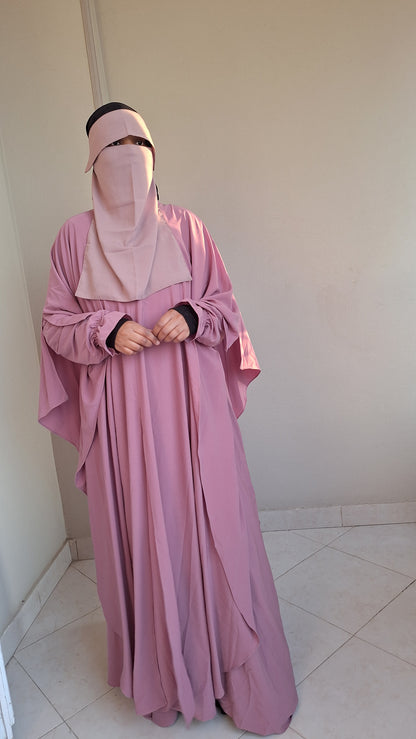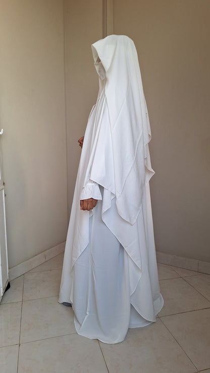 Cape longue : Se porte par-dessus l’abaya pour une couvrance optimale. Fluide, sans manches, elle s’enfile facilement par la tête, elle est fendue sur les côtés pour une grande liberté de mouvement.