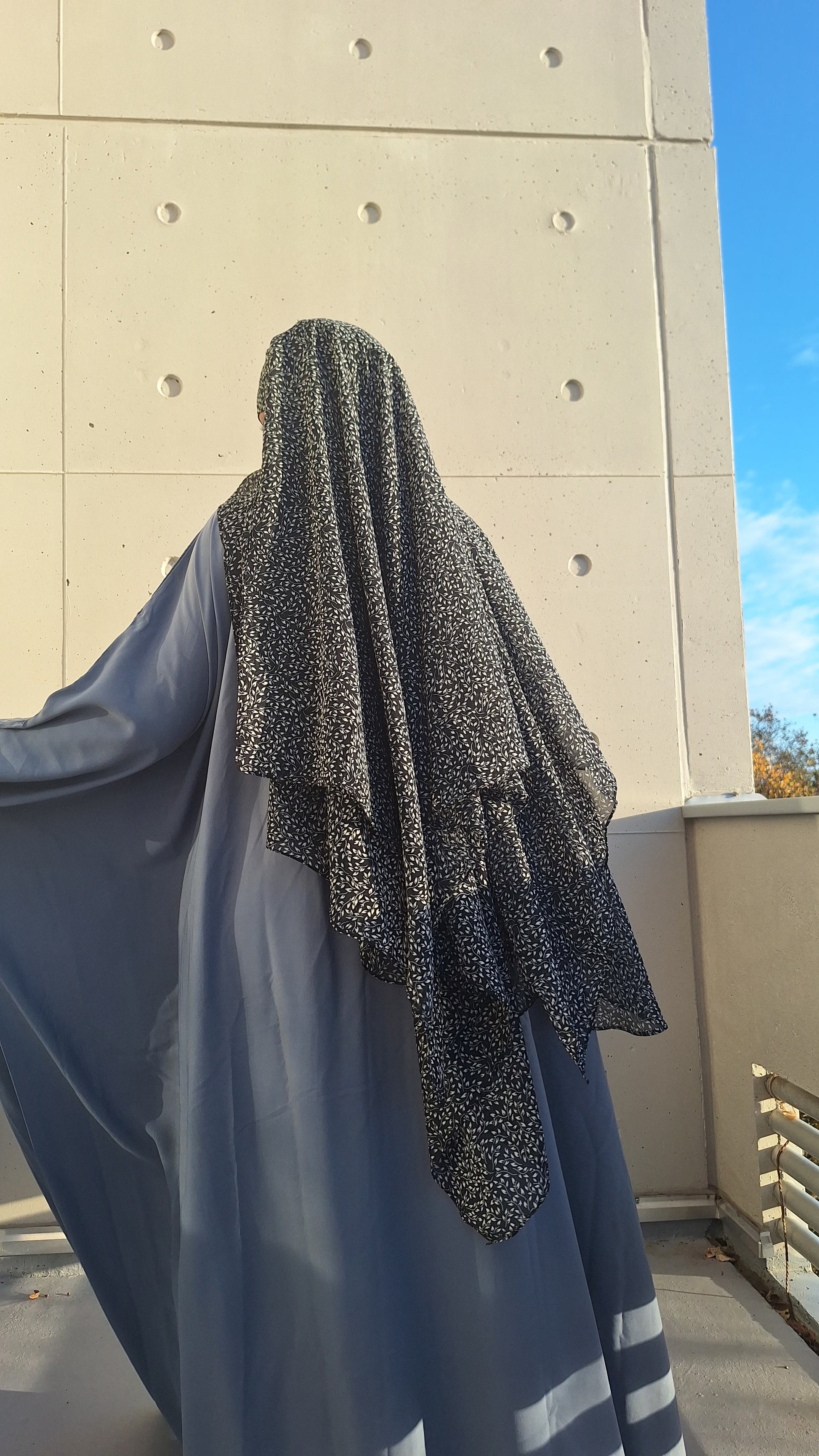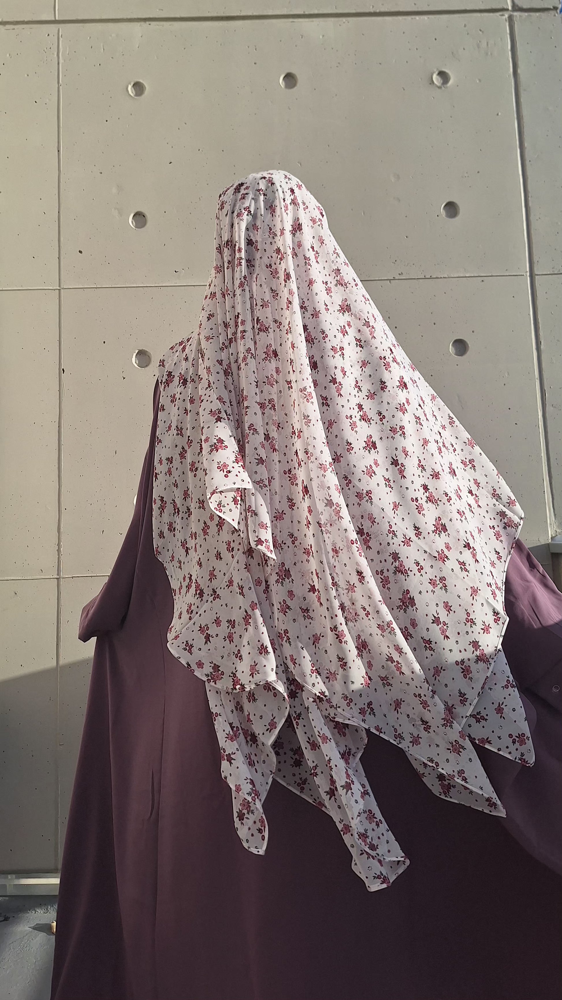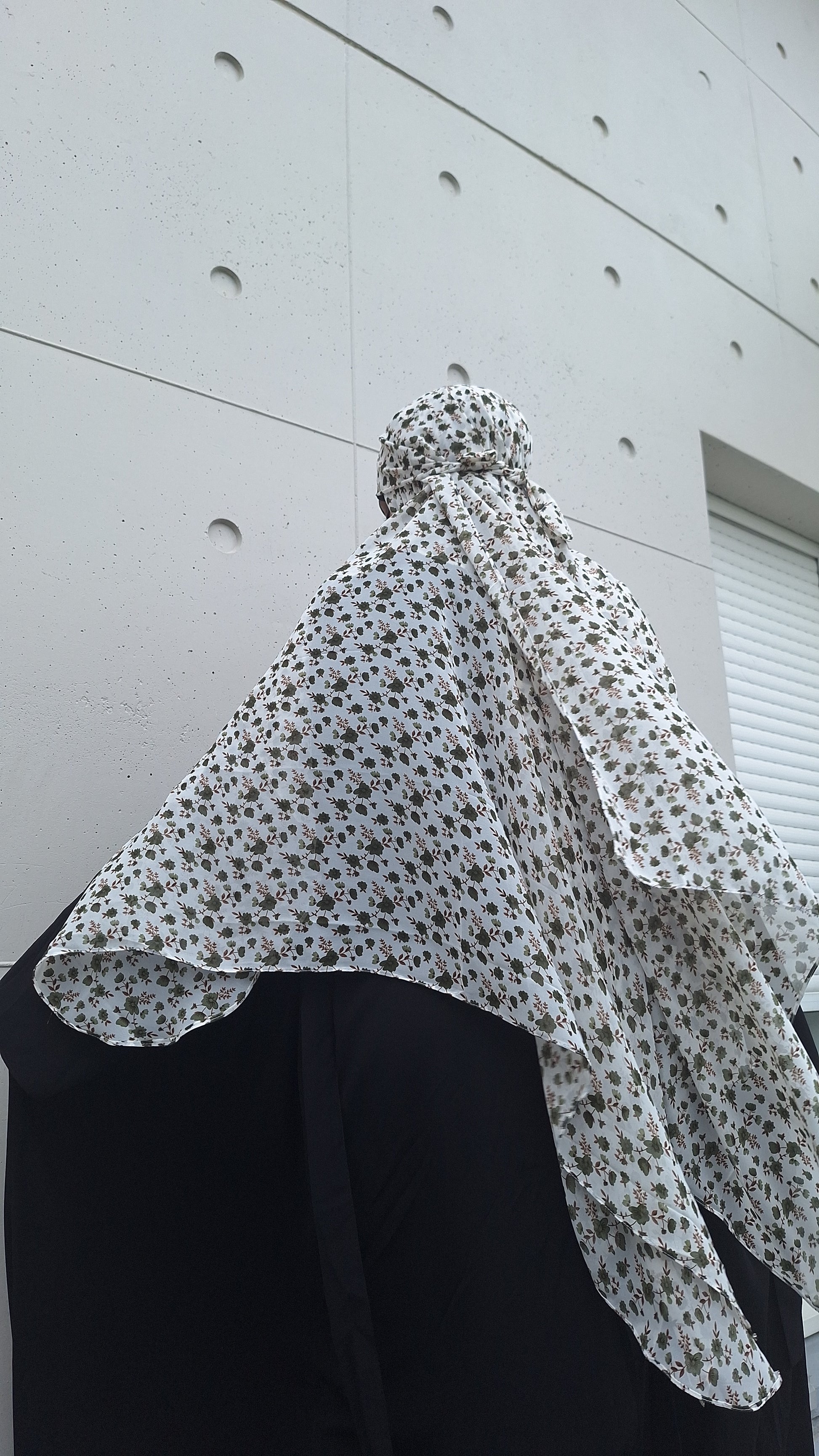 Cet ensemble se compose d’un hijab carré léger de 150x150 cm. Il est accompagné d’un second hijab à attaches style khimar, que l’on noue par-dessus pour offrir davantage de couvrance et une touche d’élégance en plus. Le motif fleuri apporte fraîcheur et féminité à votre tenue.