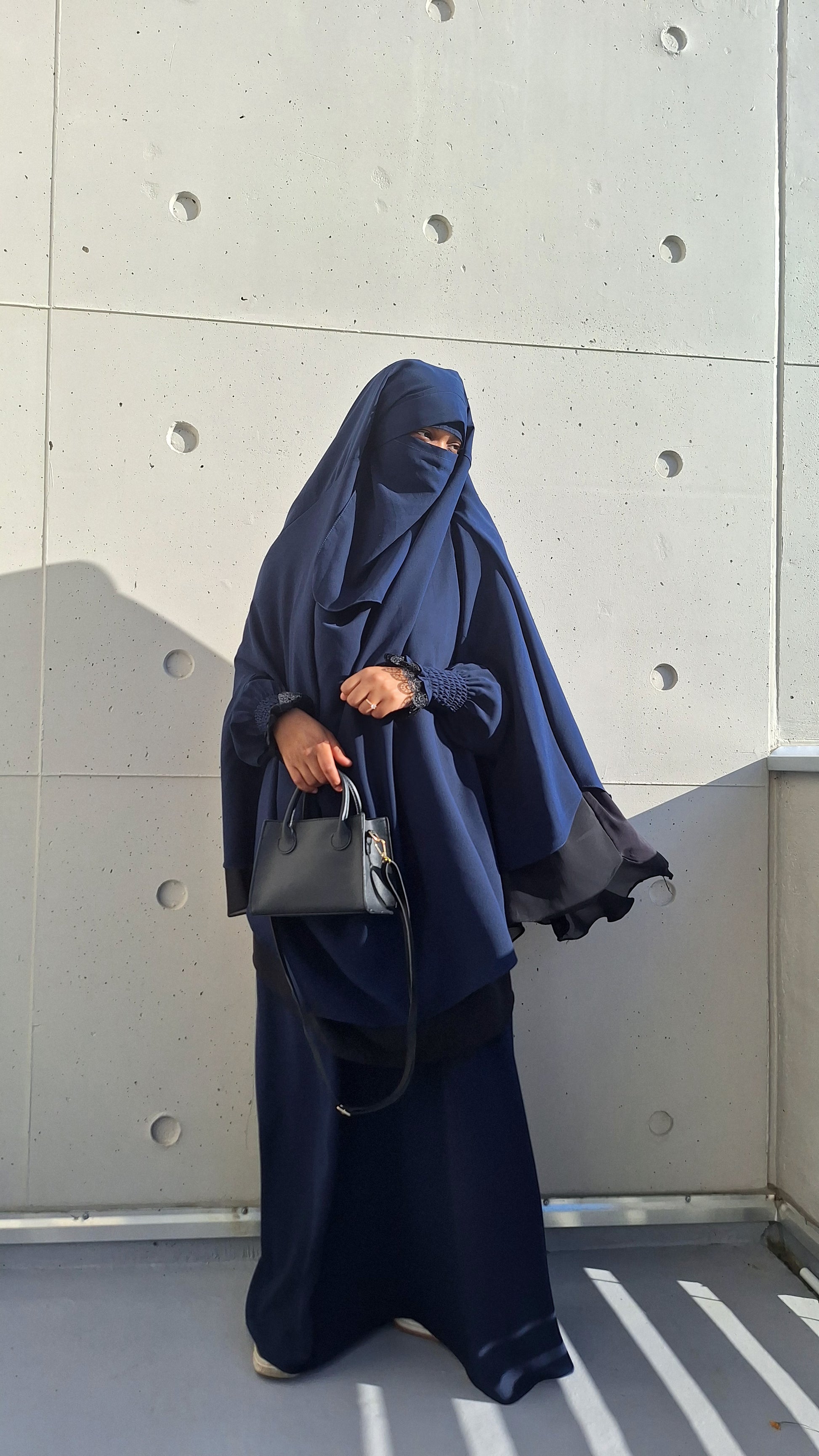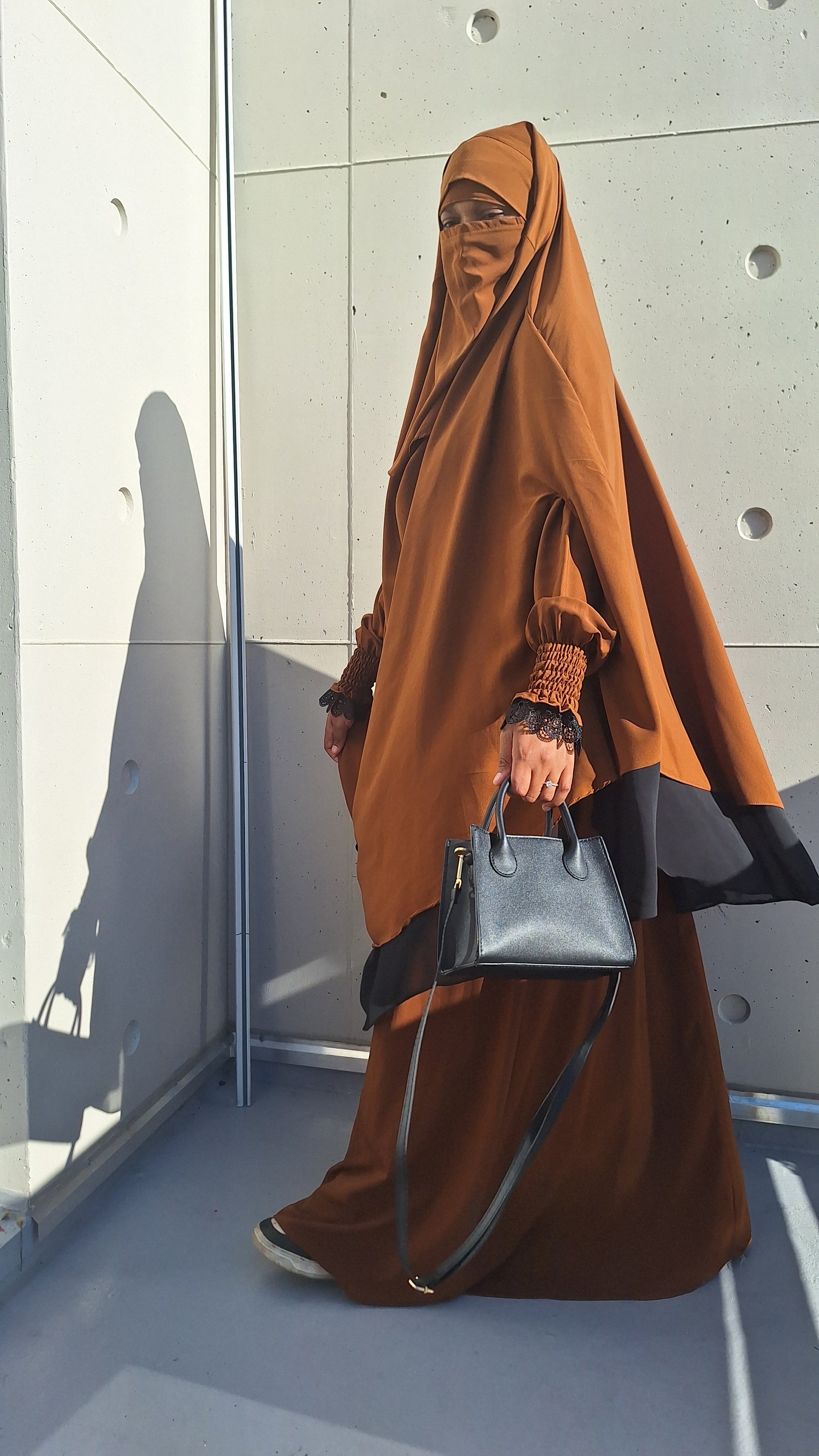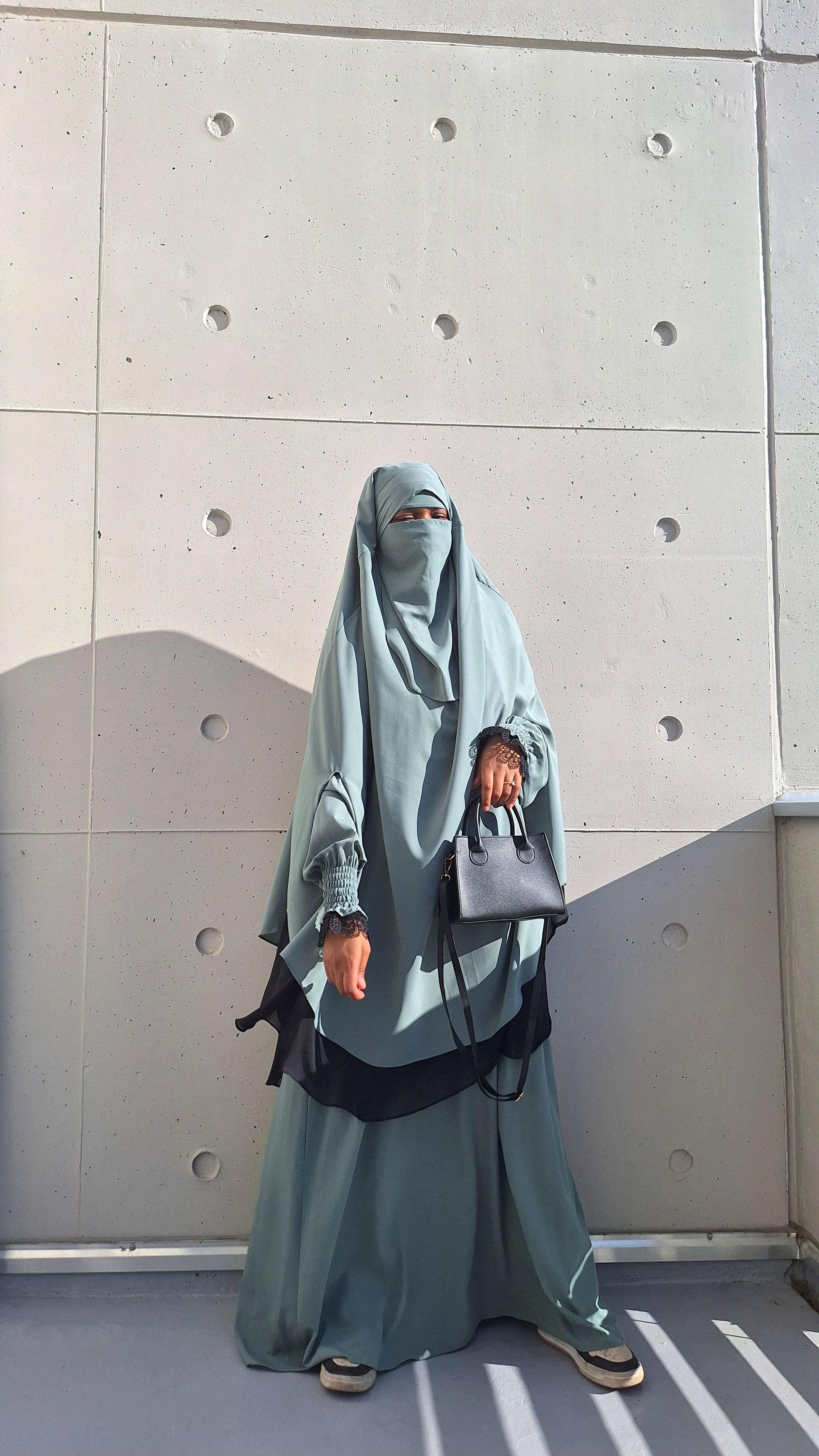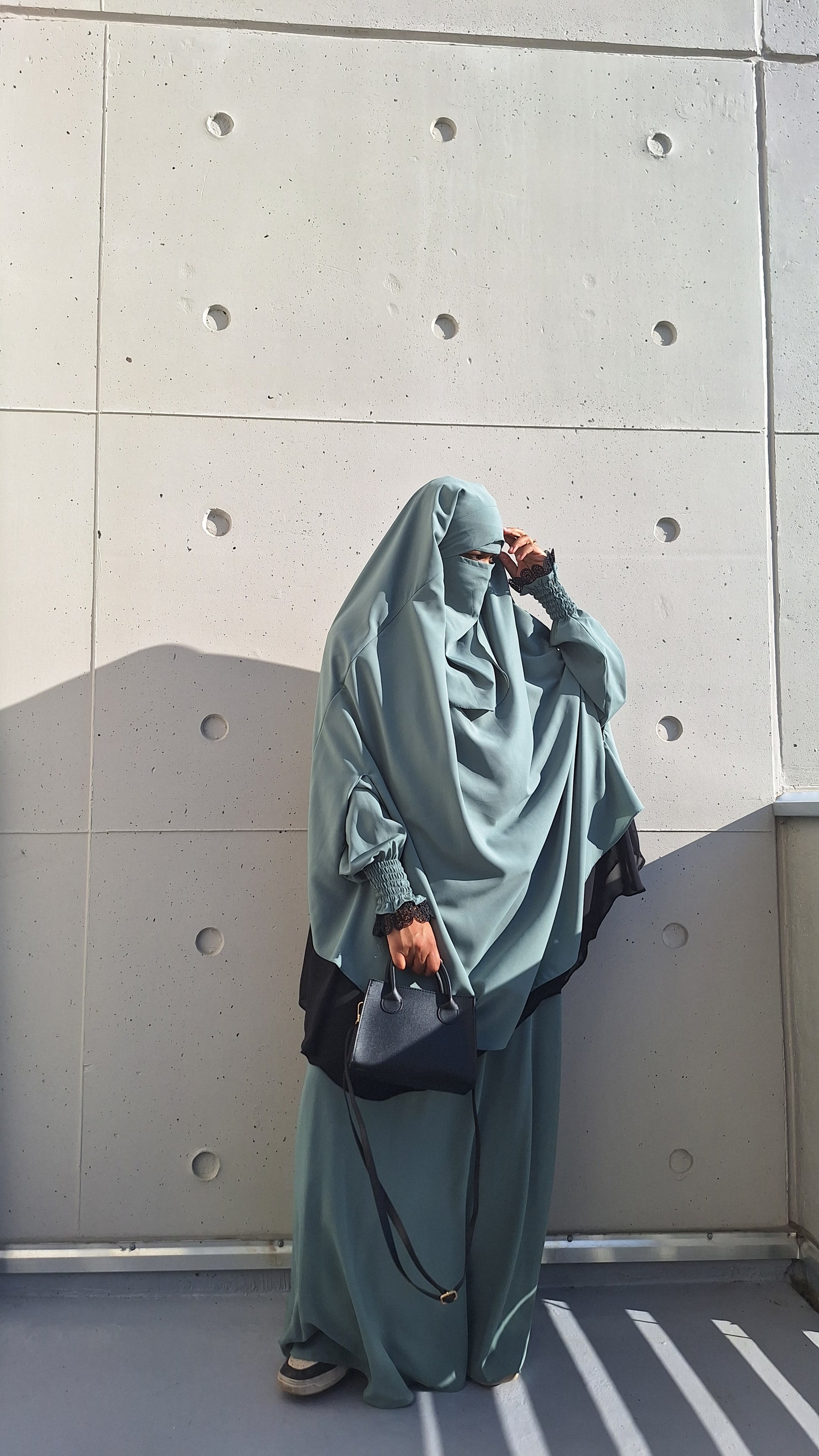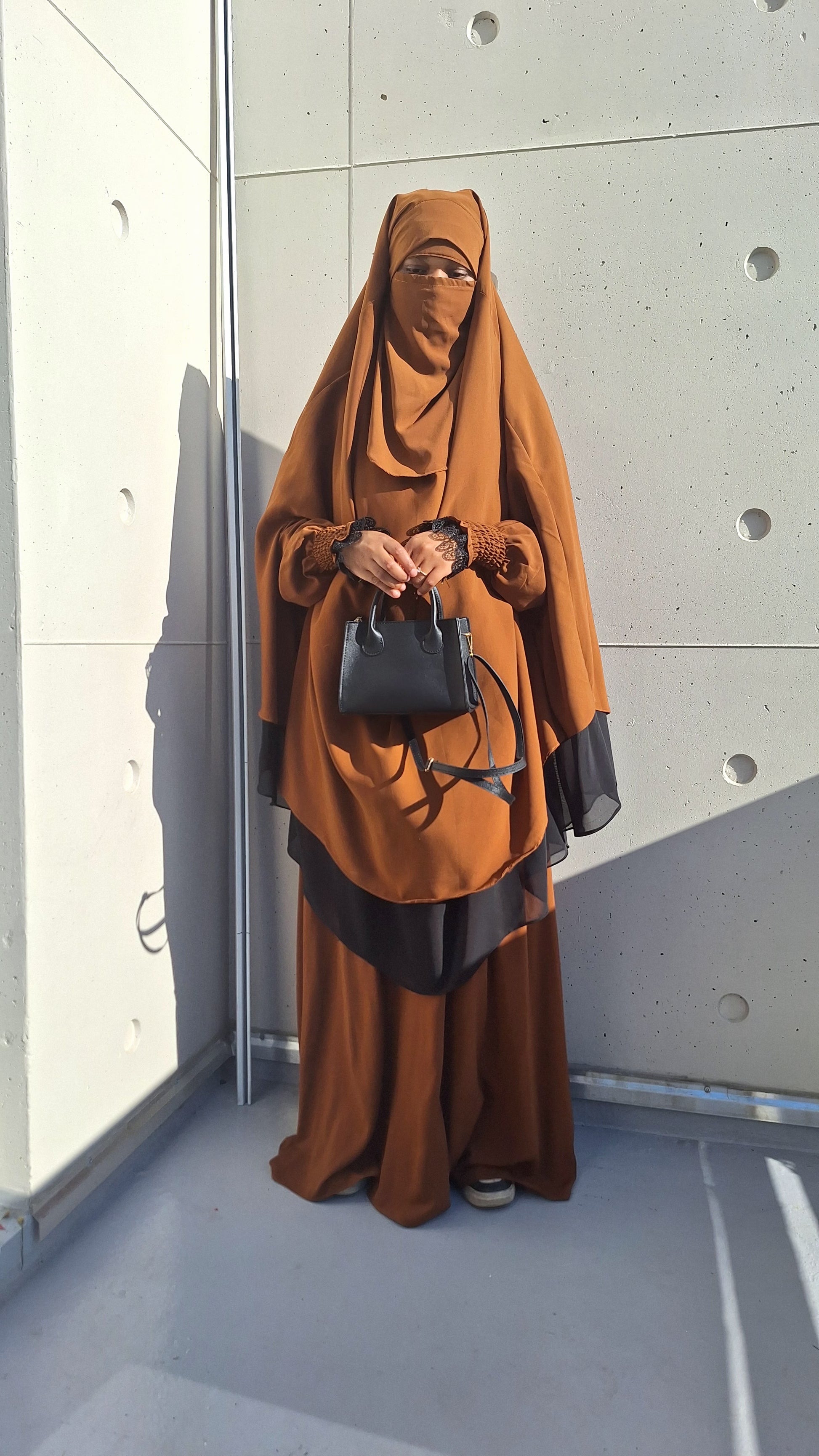 ✔ Niqab assorti : Un niqab discret qui complète parfaitement la tenue pour un look harmonieux et pudique.